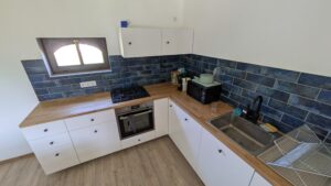 A konyha és az étkező jól felszerelt: tűzhely, sütő, mikró, hűtő, fagyasztó, melegszendvics sütő és kávéfőző is rendelkezésre áll. Az étkezőasztal és az étkészlet akár 7-8 fő számára kínál étkezési lehetőséget.