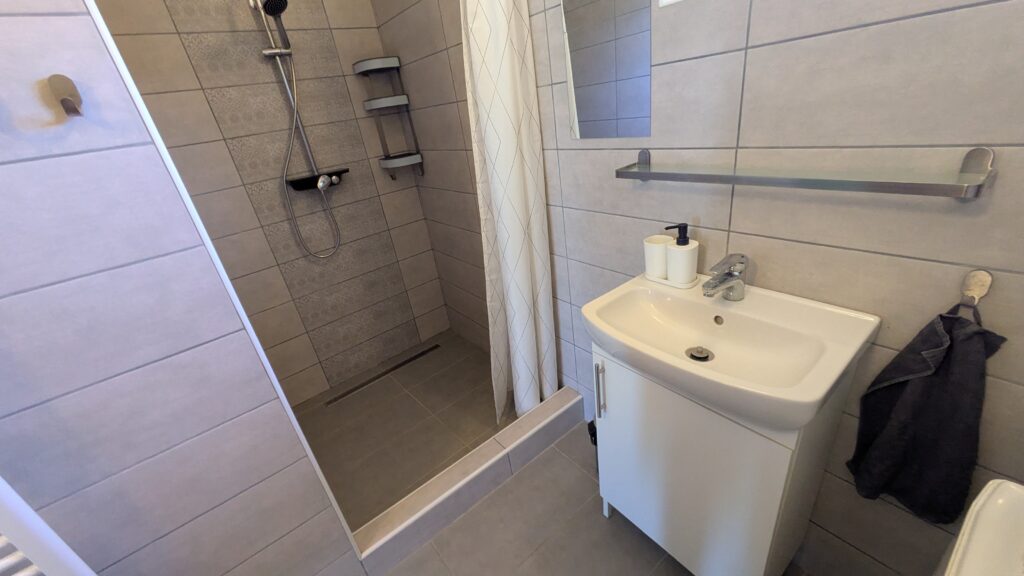 A vendégház fürdőszobájában kád és zuhanyzó is található, a mellékhelyiség pedig külön helyiségben kapott helyet.